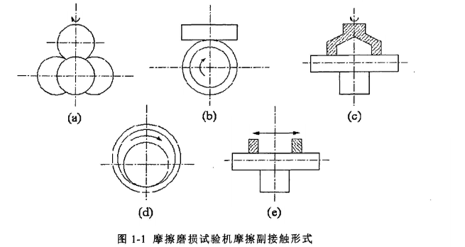常見的摩擦磨損試驗機摩擦副接觸運動方式在下圖中列出,其中a.圖所示的是四球摩擦磨損試驗機的摩擦副接觸方式。上球卡在一個專用彈性夾頭內,下面三個球固定并加以載荷,此種方式下設備試樣接觸形式是典型的點接觸,可以通過測量摩擦力和接觸磨斑直徑的變化來評定潤滑劑的承載能力。b.圖所示的是環(huán)塊試驗機摩擦副接觸方式,此種方式下接觸形式為線接觸,通過測量上試樣摩擦力大小和磨痕的寬度來評定上試樣摩擦磨損性能。c.圖所示為端面摩擦磨損試驗機的摩擦副接觸方式。主要采用面接觸形式,上試樣加工呈環(huán)形端面,下試樣為待測樣品。特別適合于在油潤滑和干摩擦條件下,對式樣的摩擦磨損性能進行試驗檢測。d.圖所示為PV摩擦磨損試驗機的摩擦副接觸方式,主要用來測定軸承合理的配合間隙和PV值。e.圖所示為往復摩擦磨損試驗機摩擦副接觸方式,上試樣下試樣均加工成塊狀,上試樣以一定額率在下試樣表面做往復運動,以此來評定下試樣的摩擦磨損性能。目前,已有許多新型的多功能摩擦磨損試驗機,他們具有多種試件接觸和運動形式,只要更換試件加劇模塊,就可以完成多種不同類型的實驗和組合實驗。